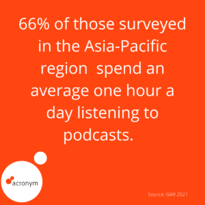 According to consumer insight company, GWI, sixty-six percent of those surveyed in the Asia-Pacific region claim to spend an average of one hour a day listening to podcasts.