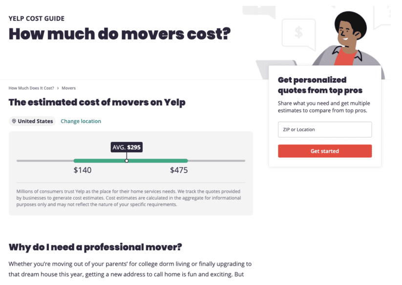 Yelp’s Project Cost Guides provide details on what hiring a professional for a given project might involve, including an estimated cost, based on Yelp’s historical data.