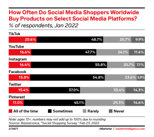 According to eMarketer, people who shop on TikTok browse and buy goods more frequently than shoppers on other social platforms. More than one-fifth of TikTok shoppers worldwide said they bought goods on TikTok “all of the time,” ahead of all other platforms measured.