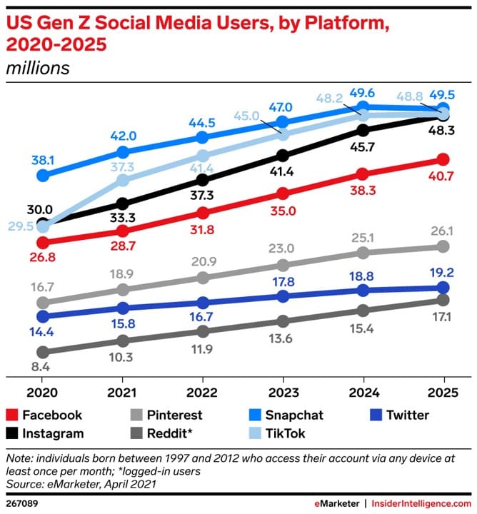 eMarketer predicts these will remain the most popular among Gen Z over the next four years. However, they say TikTok will pass Instagram to claim the number one spot by the end of this year.