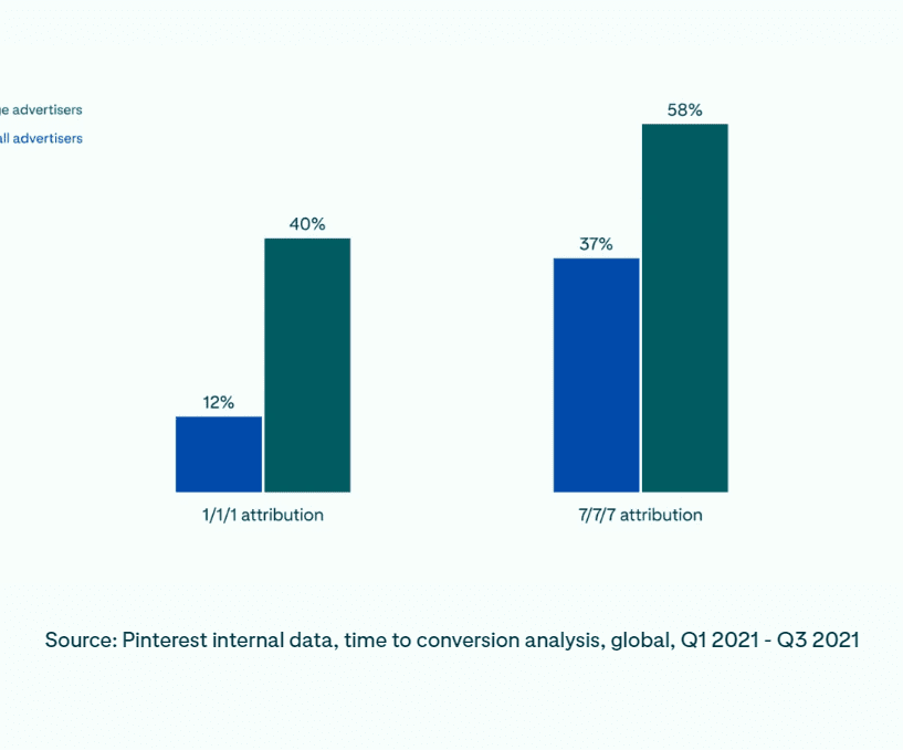 For Pinterest ads in particular, advertisers large or small on Pinterest are much more likely to receive conversions when they extend their attribution window from 1/1/1 (1/1/1, or 1 day click, 1 days to engage, 1 days to view) to 7/7/7 (7/7/7, or 7 day click, 7 days to engage, 7 days to view).