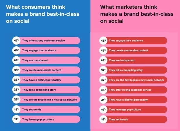 Marketers often overlook how vital handling Customer Service is on Social Media. Consumers think it is the number one trait that makes a brand best-in-class on social, whereas marketers rank it back in sixth place. Social Media is also, by far, the preferred channel for consumers to share product/service feedback or reach out to a brand for a customer service issue or question. A brand that is “best-in-class” on social media will have separate teams (possibly separate social accounts) handling and specializing in the marketing and customer service aspects of their Social Media channels.