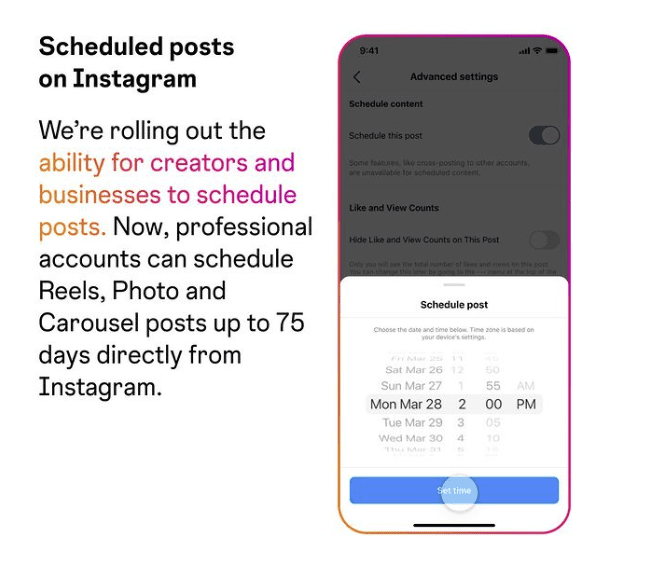 Instagram is rolling out its new in-app post scheduling tools to all professional accounts in the app. The new option enables brands to schedule photos, carousels and Reels directly in the app, as much as seventy-five days in advance.