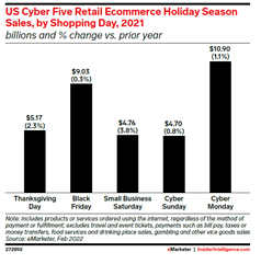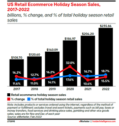 To look ahead to this year, we need to evaluate 2021. The prior holiday season had the “strongest retail growth in more than 20 years” due to increasing customer spending. The expectation is for this metric to grow to 1.262 trillion in 2022, with 15.5% coming from e-commerce, while brick-and-mortar is expecting 1.026 trillion.