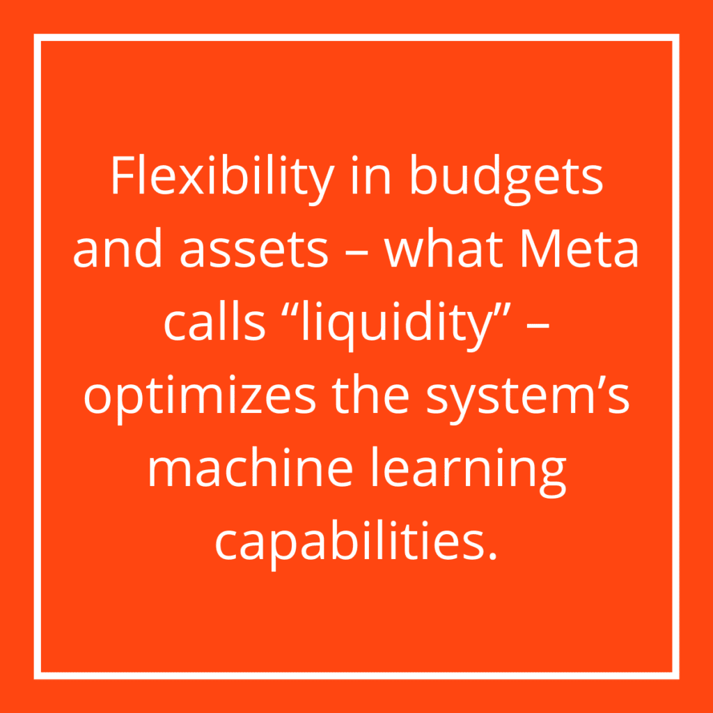 For brands with nimble budgets, it can be tempting to make every dollar count by designating dollars to specific ad groups based on previous performance costs. But doing so based on an evaluation of campaigns using CBO will deliver the opposite effect because individual ad sets & ads should not be viewed in isolation as performance costs of individual entities in a CBO campaign are not the best indicator of success. And, also because this limits the system’s ability to learn and move budget in a fluid manner based on real-time happenings in the auction. Flexibility in budgets and assets – what Meta calls “liquidity” – optimizes the system’s machine learning capabilities.
