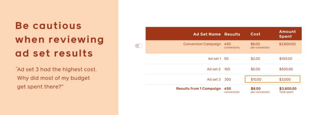 As Meta explains, when individuals review a report like the one above, a common misconception is that Meta’s machine learning moves more budget to underperforming ad sets – a phenomenon dubbed “The Breakdown Effect.”